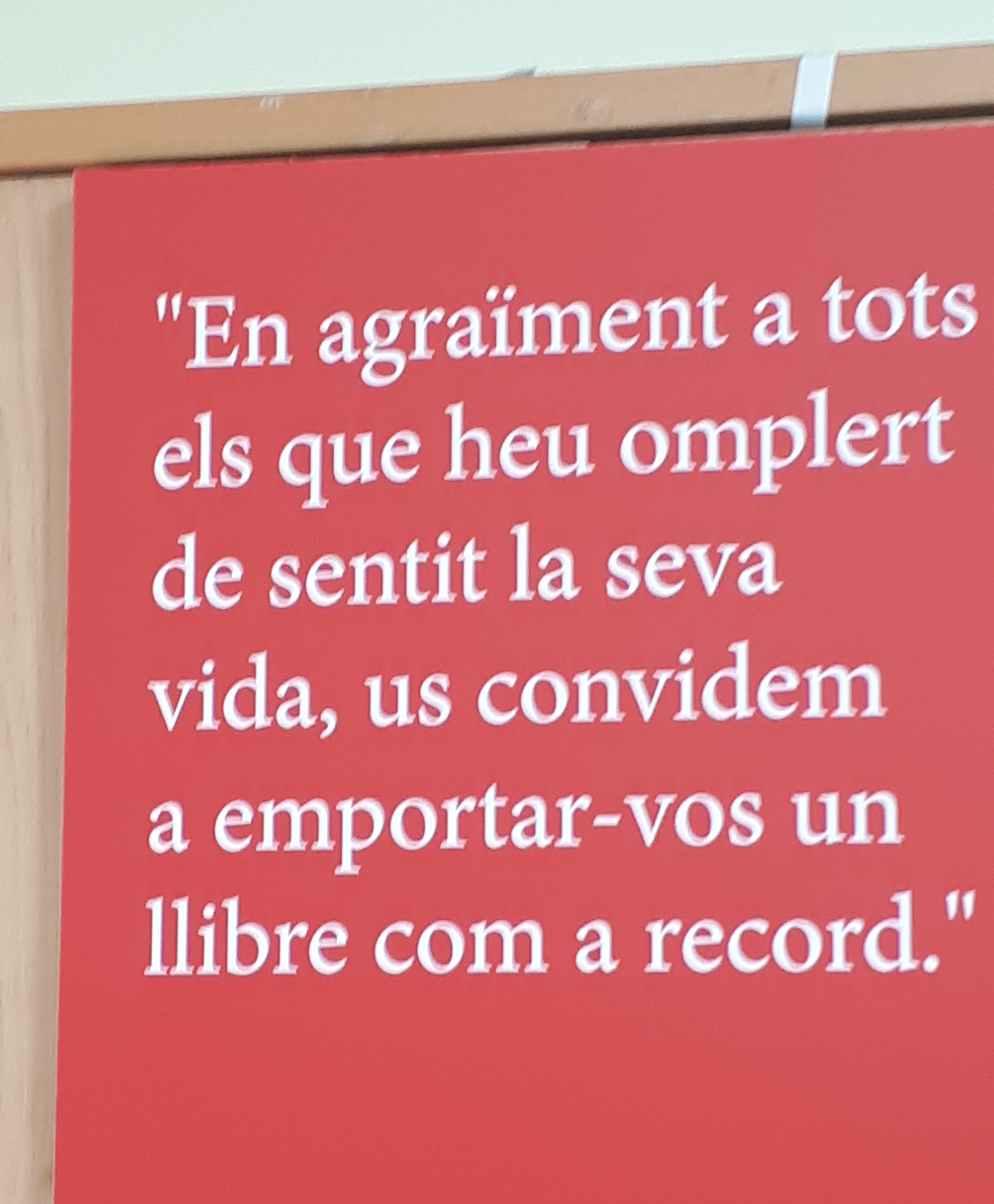 Amb aquesta "injecció" de felicitat vaig entrar a l'auditori on es faria l'acte. I aquí vaig tenir el segon impacte. En un petit vestíbul la nombrosa gent que havia acudit s'arraulia al voltant d'un mostrador on s'hi veien llibres. De la Carme, òbviament. Vaig pensar: "estarà bé mirar si en puc comprar algun que no tingui". Vaig remenar-ne uns quants -n'hi havia de més acadèmics, de més personals, sobre les llengües i escriptors africans que tan bé coneixia, d'altres d'estudi del seu entorn més proper, les escoles de l'Anoia que ella anomena "escoles de frontera", la Revista d'Igualada, òbviament també n'hi havia sobre la llengua catalana... i vaig triar-ne un que em venia molt de gust, un dietari seu, "Tancat temporalment", escrit casualment el 2020 l'any de la pandèmia. Quan anava a pagar-lo, em diuen:"No, aquests llibres són perquè els agafeu" i em va senyalar un rètol en vermell penjat al darrere. "La Carme ha estat generosa com ella fins al final" em va sortir, convençudíssim que darrera aquell regal també hi era ella, encara que el cartell no ho digués expressament.